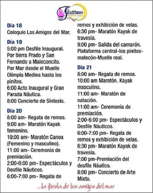 Regatas de remo, canotaje y vela, exhibiciones de aeromodelismo, lanchas con paracaídas, motos aquabike, desfile de carrozas náuticas, maratón de atletismo, conciertos, coloquios, comparsas y el tradicional recibimiento del camarón son propuestas del amplio cronograma de actividades.