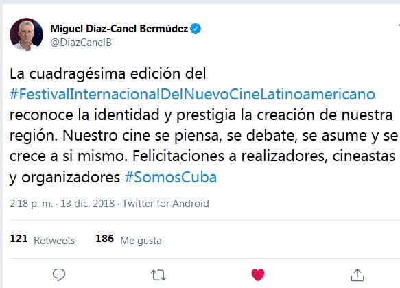 “Nuestro cine se piensa, se debate, se asume y se crece a sí mismo. Felicitaciones a realizadores, cineastas y organizadores”, escribió en su cuenta de la red social Twitter, a propósito de la celebración por estos días en la capital cubana de la cuadragésima edición del festival.